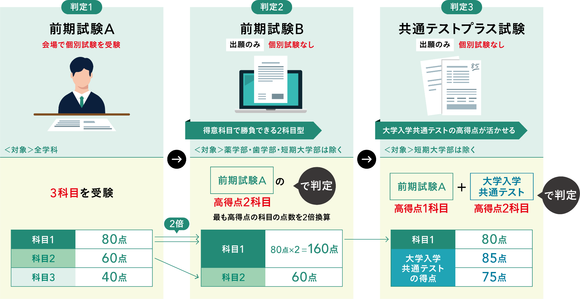 得意科目と大学共通テストを組み合わせる試験や、大幅に学納金が免除される特待生制度対象試験など、
